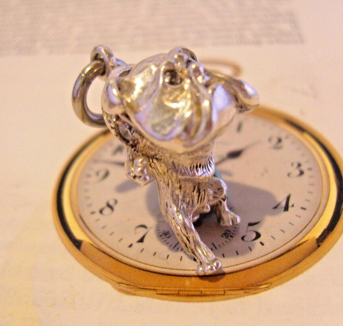 Fob Bulldog Vintage 1970s Silver 925 Pocket Watch Chain Large Canine & Crystal Fob