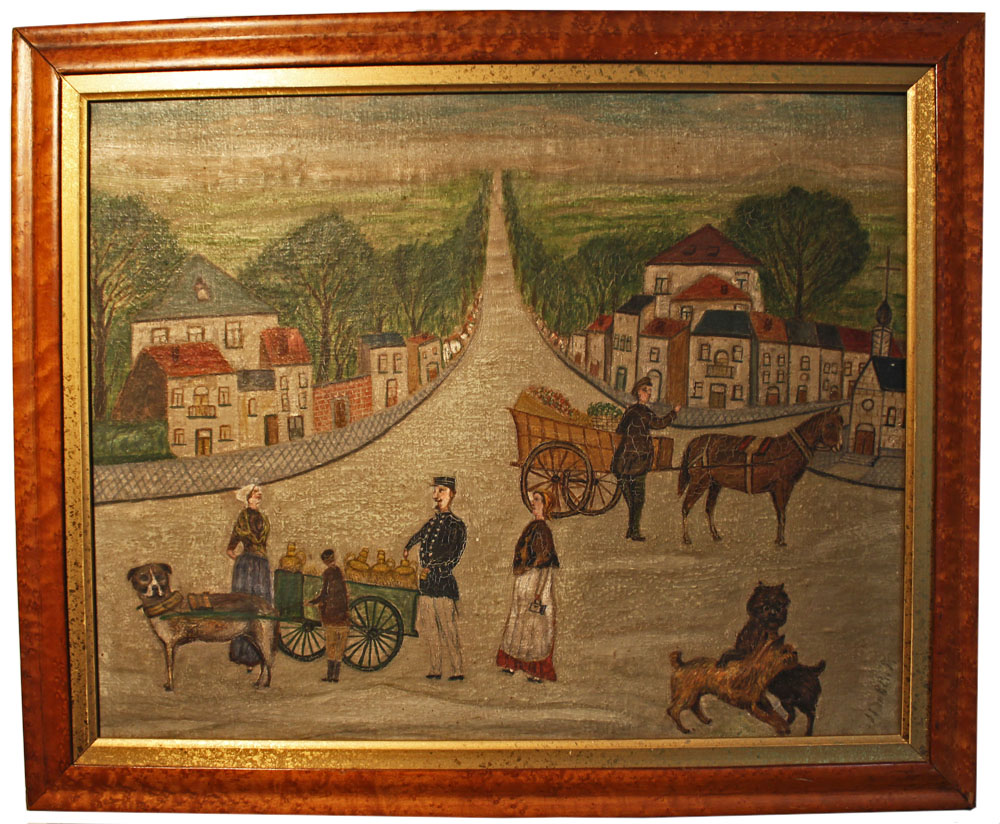 Folk Art. Antique Naive Painting Oil On Canvas of Village Scene with Milk Seller & Dog Cart C.1890
