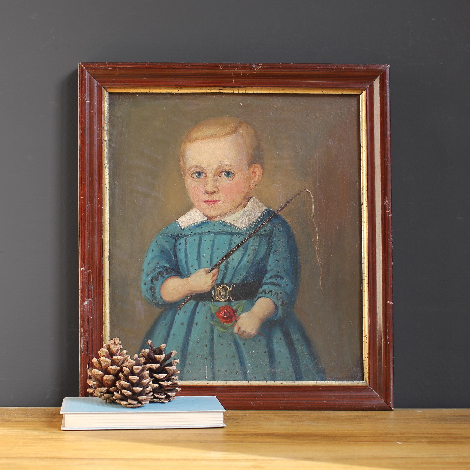 Folk Art Portrait of a Boy with Riding Crop & Rose, Naive Painting, Primitive