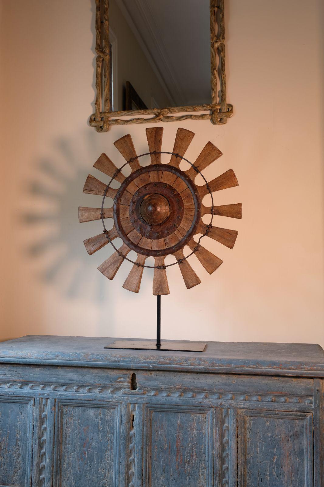 Folk Art Wheel Sculpture Teak & Iron