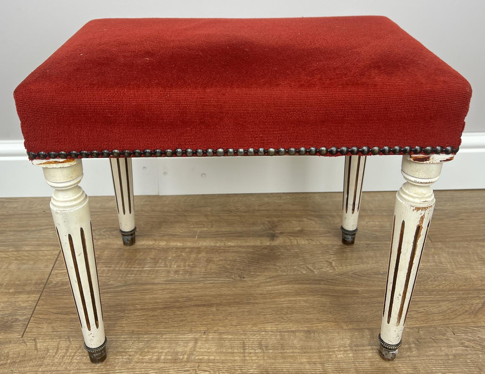 This French-style footstool features a generously padded seat upholstered in deep red fabric, finished with decorative stud detailing along the edges for a classic touch. The legs showcase a traditional turned and fluted design with a distressed painted finish, adding authentic vintage charm and character.
