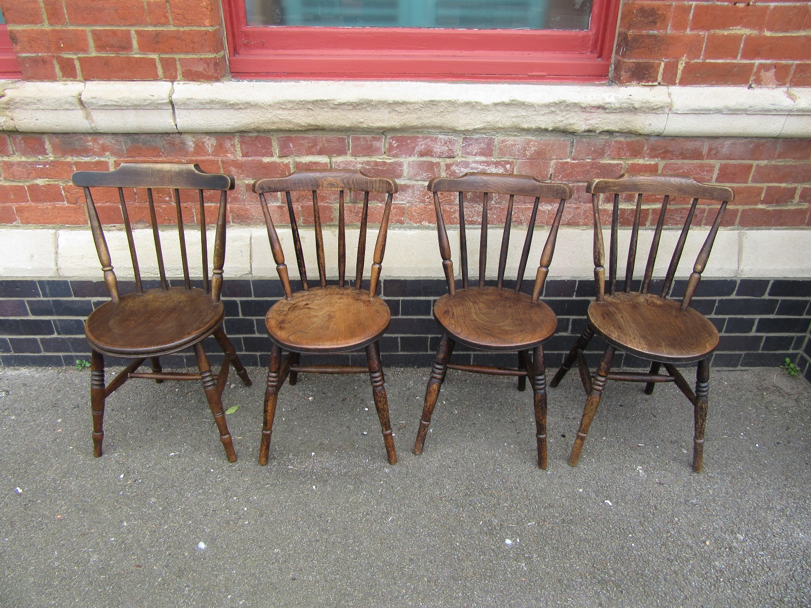 Four Antique Elm Penny Seat Country Dining Chairs
