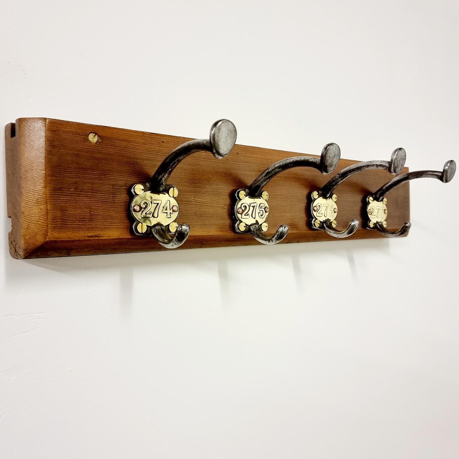 Four Antique School Coat Hooks / Hangers With Brass Numbers