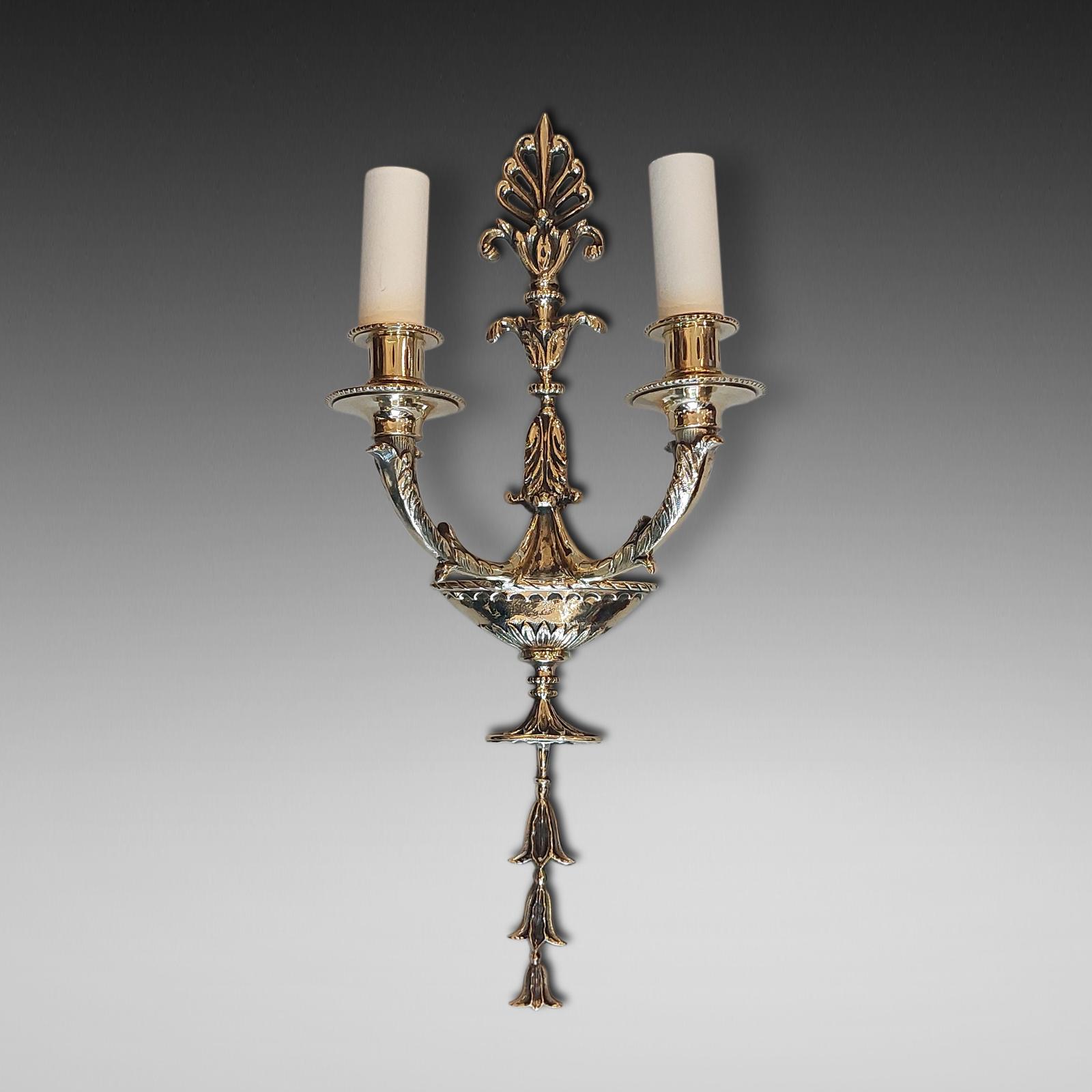 Set of four early 20th Century gilt brass 'Adam style' wall hanging lights - with urn-shaped backs and two branch light fittings to each - all lights and lamps have been rewired with authentic corded flex, fitted with either foot switch or finger clicker switch and are Pat tested.