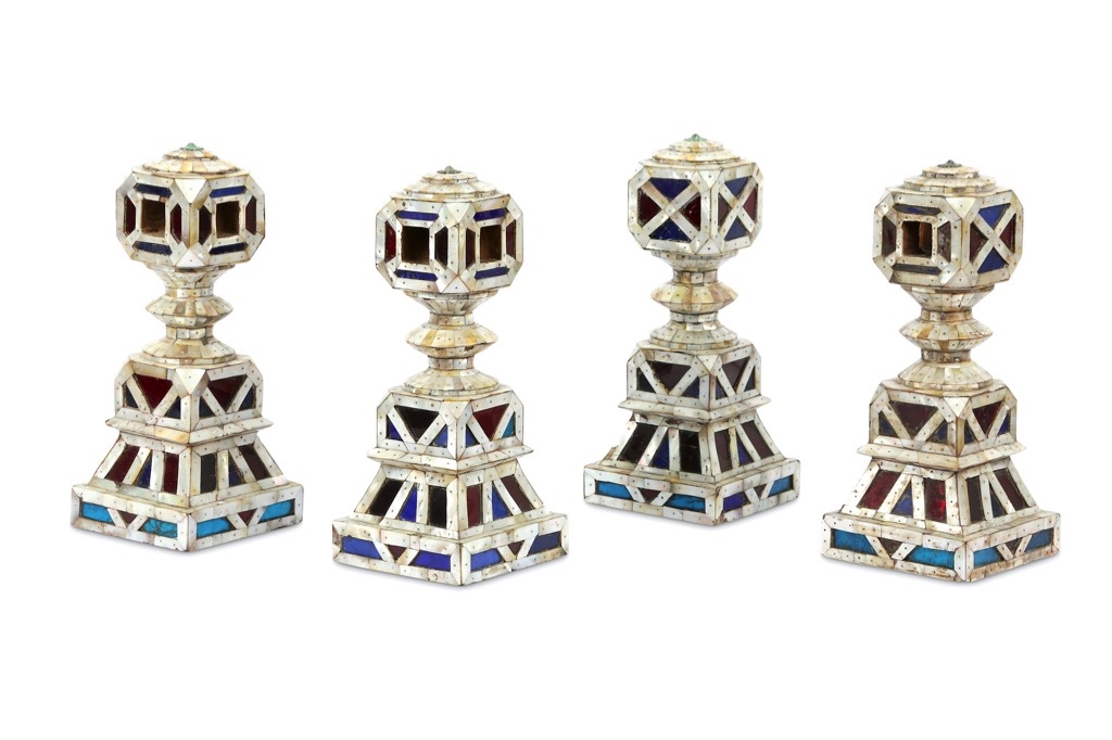Four Mother of Pearl & Coloured Glass Charpai Legs India, 19th Century