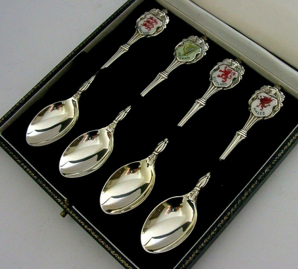 Four Sterling Silver Enamel British UK National Emblems Spoons 1963-65 Cased