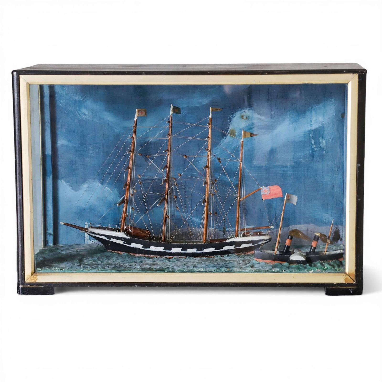 Four‑masted sailing ship diorama with steam barge in a Turneresque seascape enclosed in a glazed case, fine rigging detail, coastal charm, and very good condition