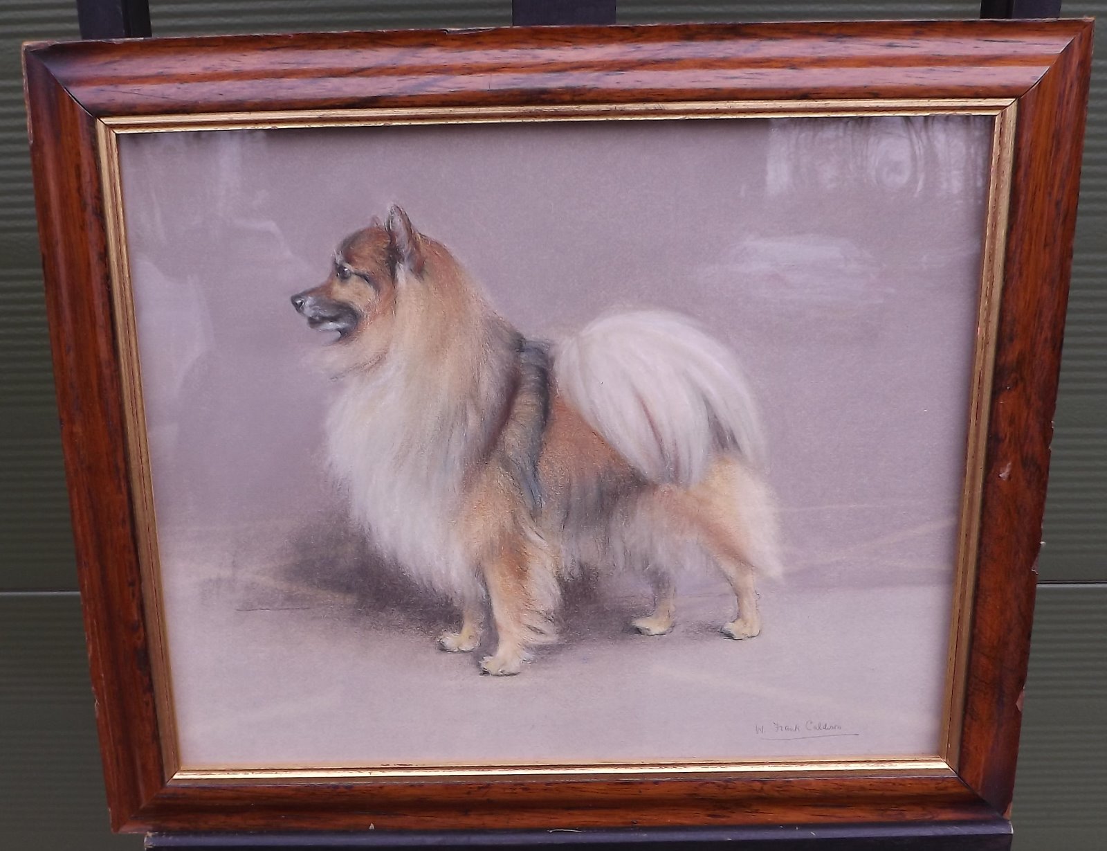 Framed Signed William Frank Calderon Pastal Drawing of a Pomeranian Dog
