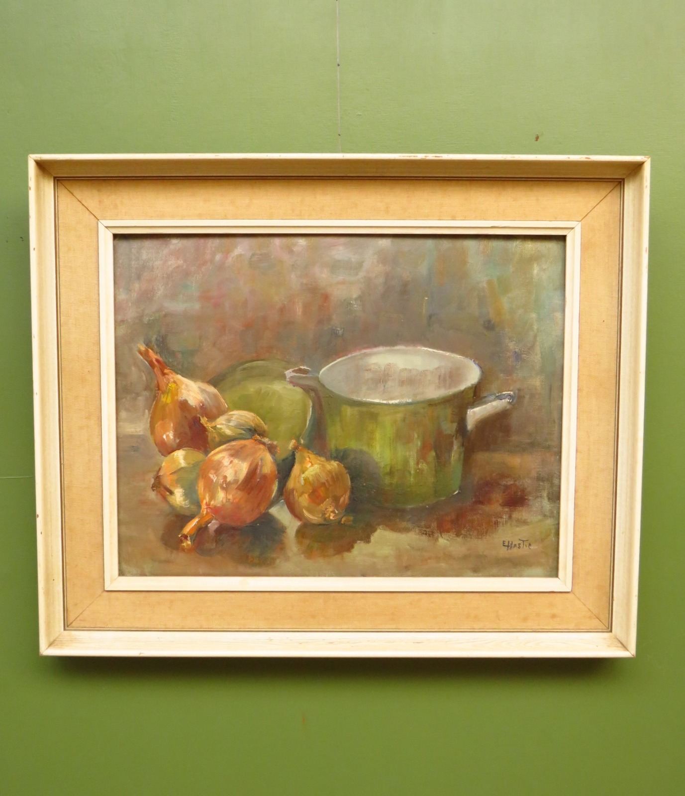 Framed Vintage Oil on Board Painting of Onions in Kitchen, Signed Elfrida Hastic
