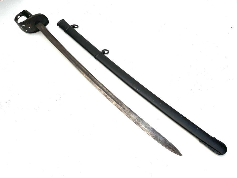 German made (not un common) scabbard dated and marked XI H for 11th Hussars (the attribution may be spurious as the date is wrong). The YC on the blade denotes later issue to a Yeoman Cavalry Regiment. Blades showing battle chips but still good has stains but will polish up. Has original scabbard which is dated for 1875 length of 106cm height + 14cm + depth 9cm.