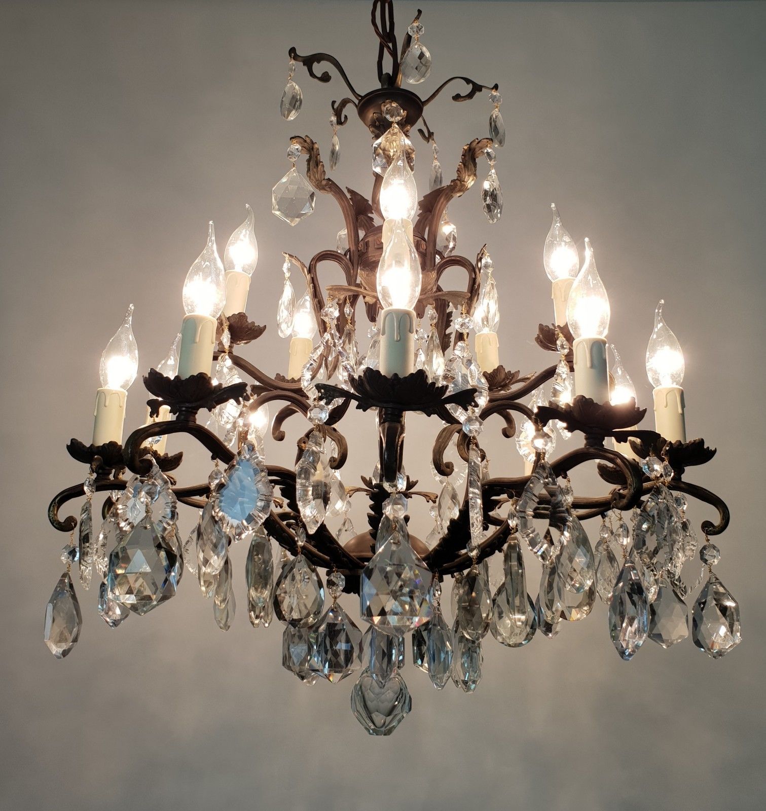 French 15 Arm Antique Birdcage Brass Crystal Chandelier, c.1910