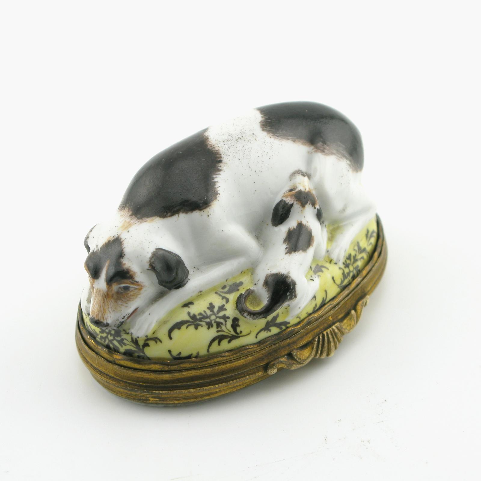French 18th Century Mennecy Porcelain Snuff Box / Bonbonniere Dog & Puppy