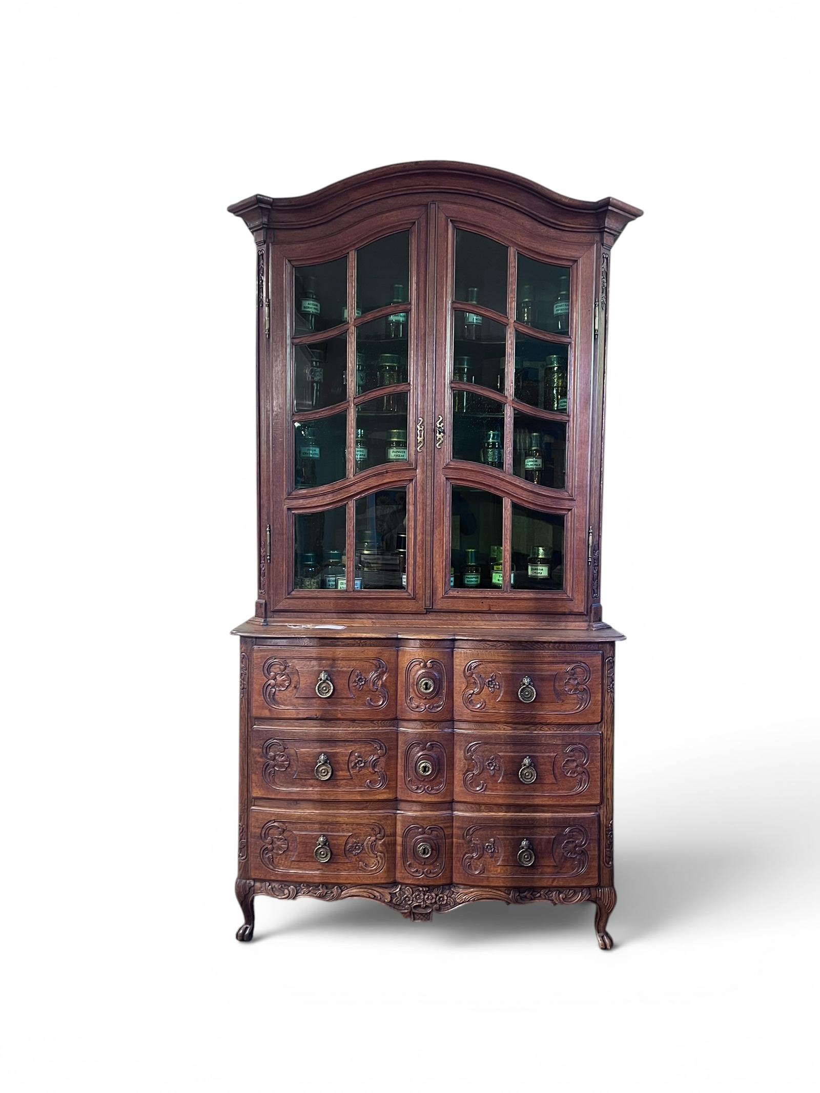 A magnificent item of French furniture, this 18th century oak piece is in two parts, with a glazed vitrine or display cabinet at the top and drawers beneath. It will look stunning in a large room and is a wonderful quality antique.