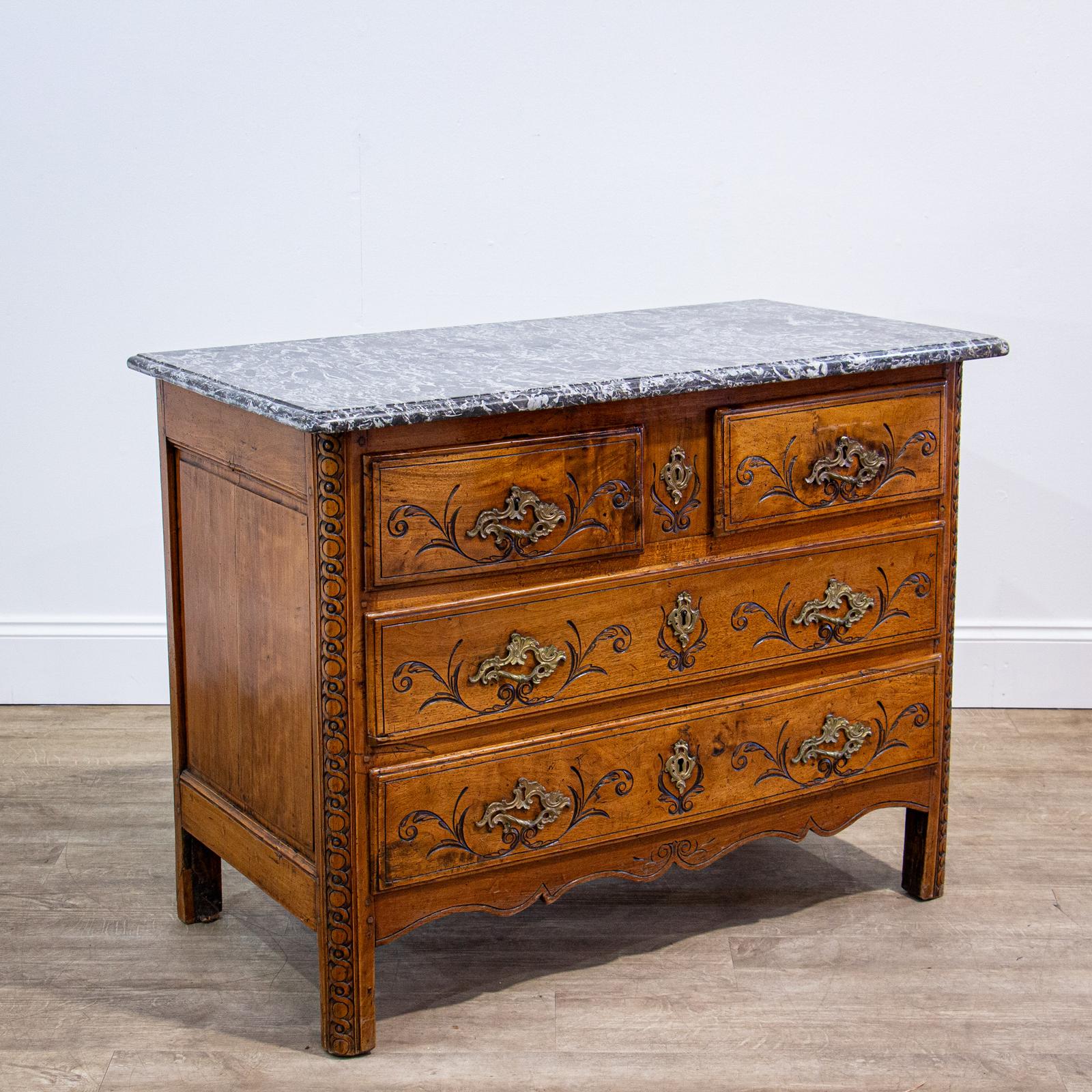 A lovely Louis XV carved walnut commode with a loose marble top, this is a compact size and will provide a splendid storage option for any room.