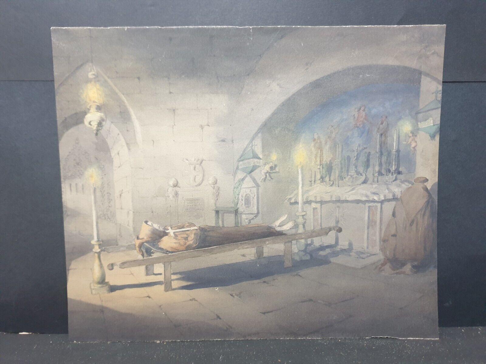 French 19th Century Watercolour Tomb Cathedral Cherubs Monk