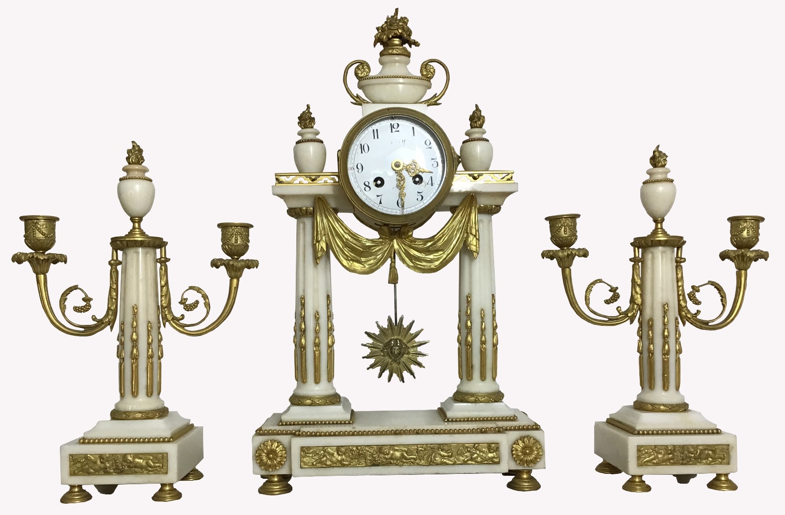 French 19th Century White Marble & Gilt Bronze Clock Garniture