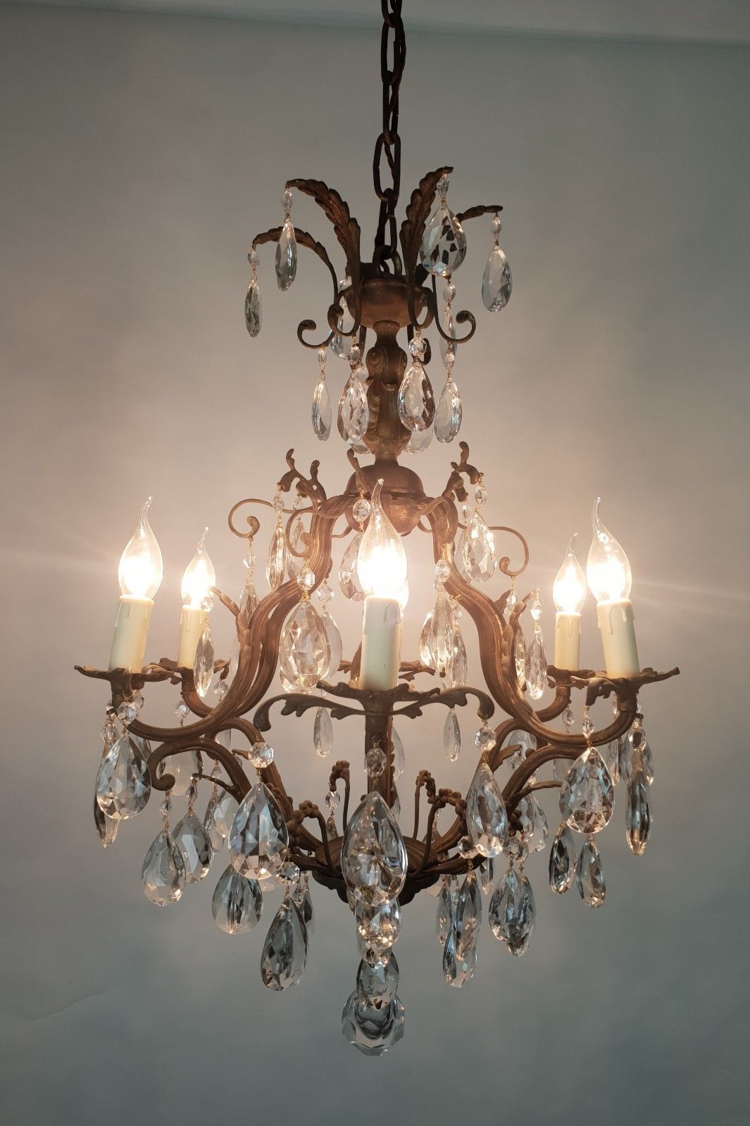 French 6 Arm Birdcage Brass Crystal Chandelier; Rewired C.1910