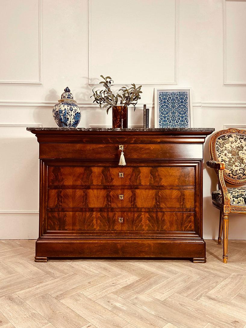 French Antique Chest of Drawers / Flamed Mahogany Commode / Desk / Secretaire