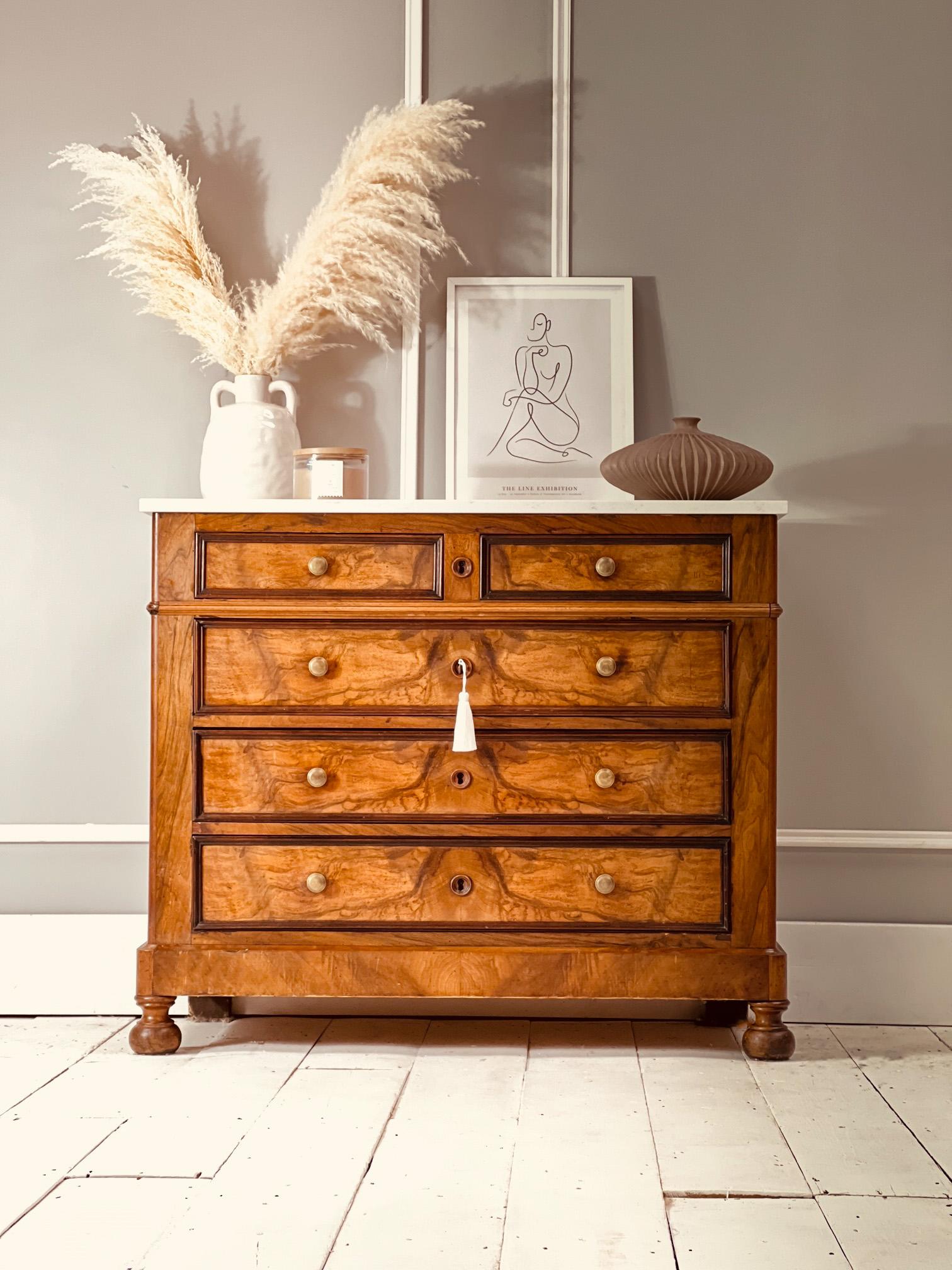 French Antique Chest of Drawers / Marble Walnut Commode