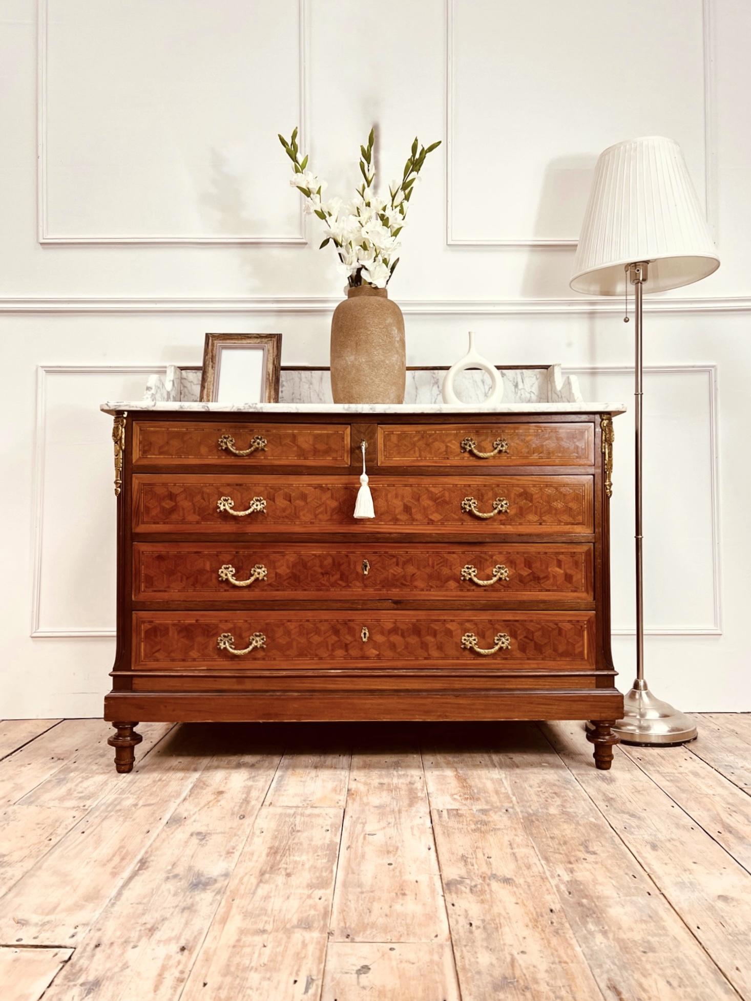 French Antique Mahogany Parquet Chest of Drawers / Marble Chest