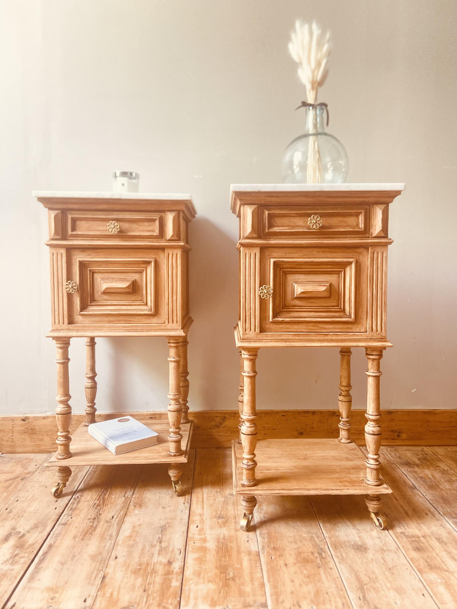 French Antique Oak Bedside Tables / Marble Bedside Cabinets / Nightstands