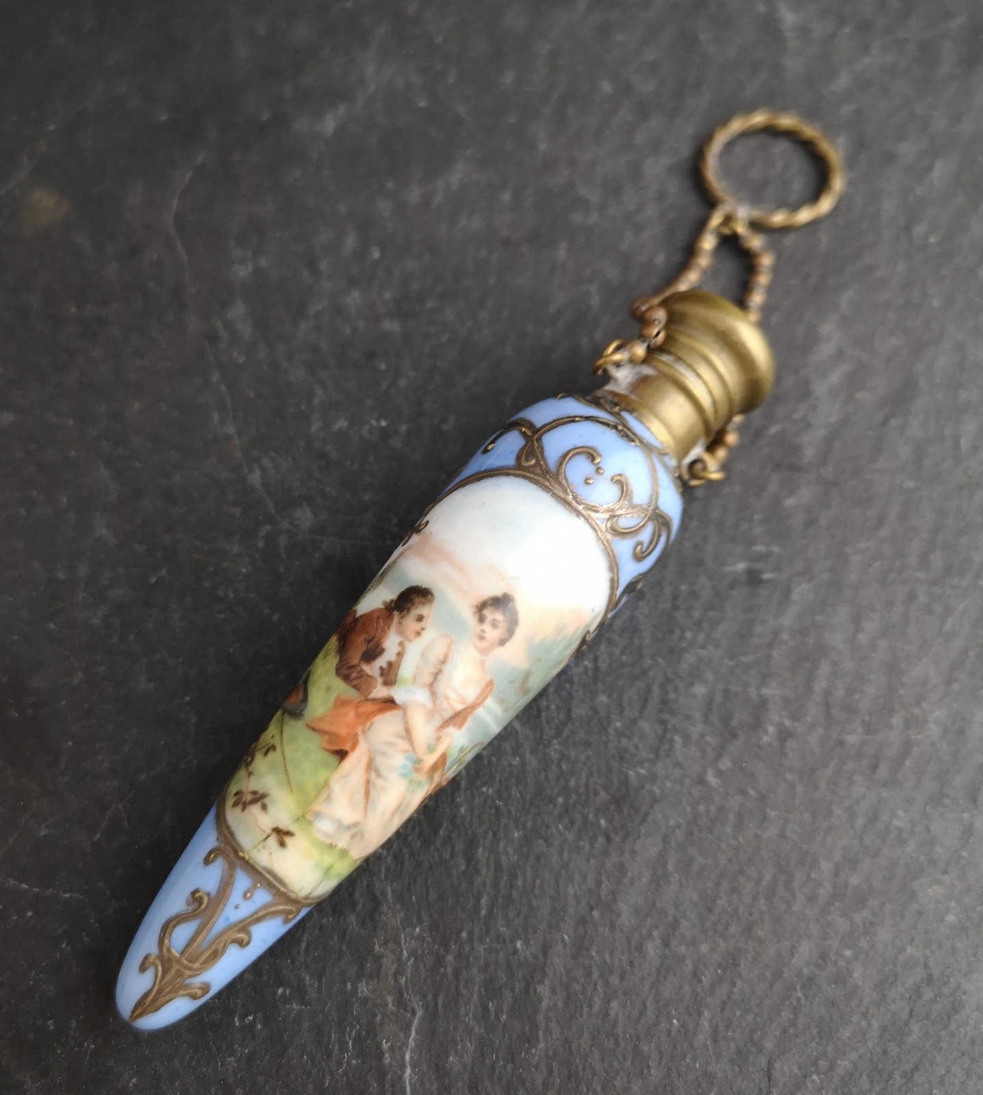 French Antique Scent Bottle, Romantic Scene, Gilt Chain Icicle Shaped Chatelaine Scent Bottle, Duck Egg Blue Enamelled Porcelain