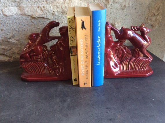 French Art Deco Burgundy Pottery La Chasse Bookends