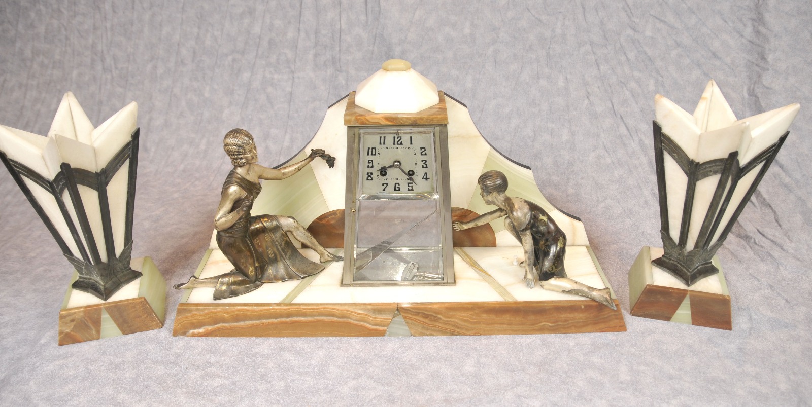 French Art Deco Mantle Clock Set Spelter Figurine Marble Urns c.1920