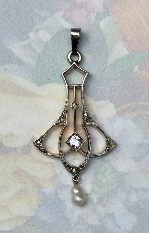 French Art Deco Pendant 18ct Yellow Gold Platinum Diamonds