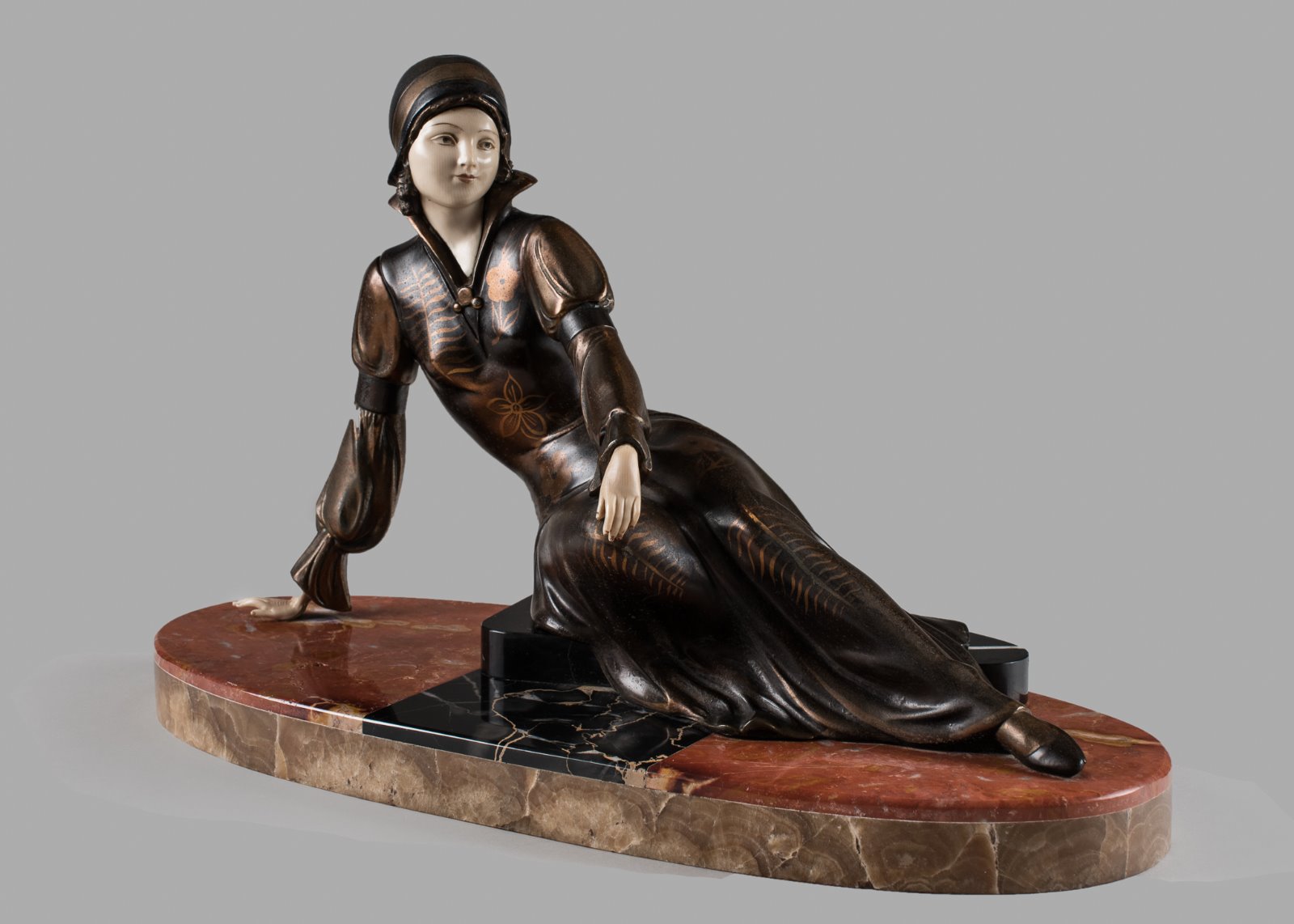 French Art Deco Spelter & Ivorine Sculpture of a Reclining Lady (1 of 1)