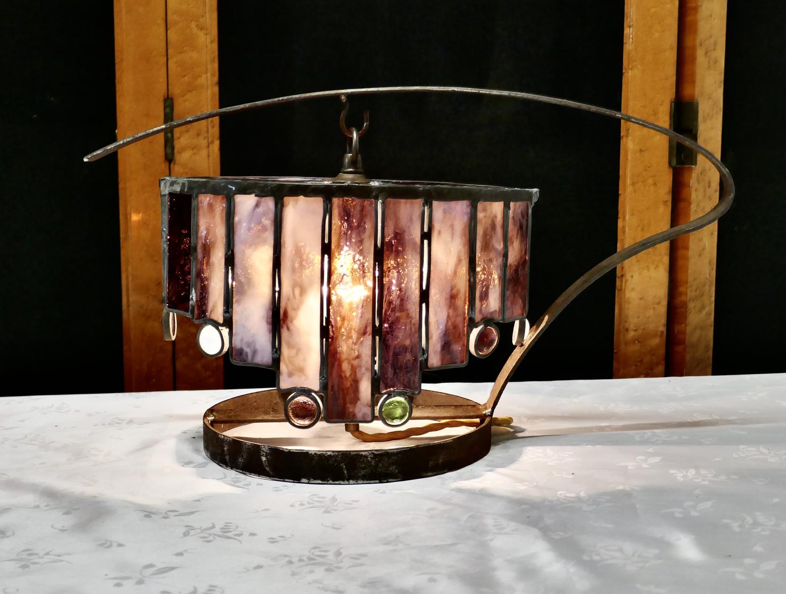 French Arts and Crafts Amethyst Leaded Glass Table Lamp