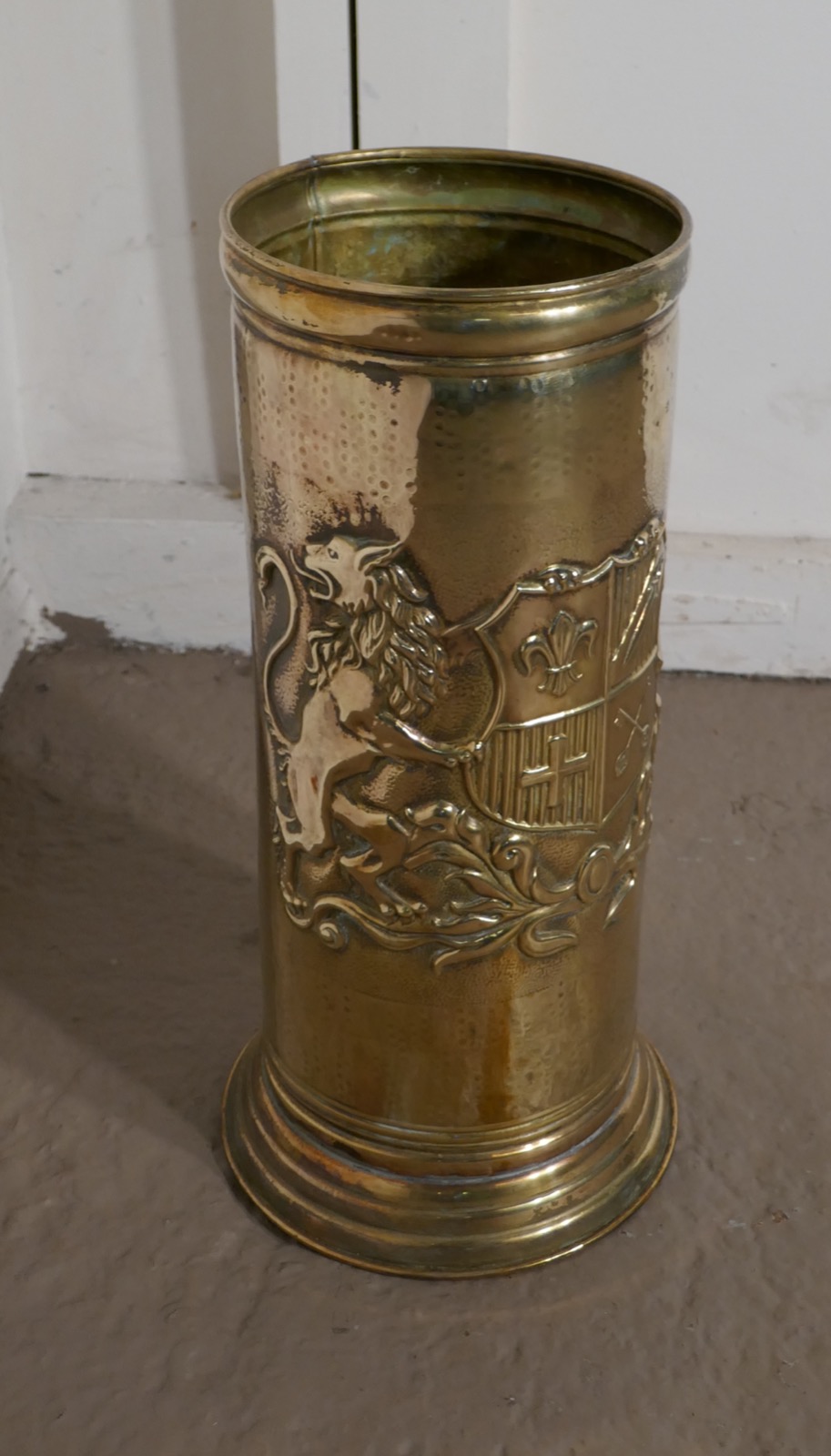 French Arts & Crafts Embossed Brass Stick Stand, Umbrella Stand
