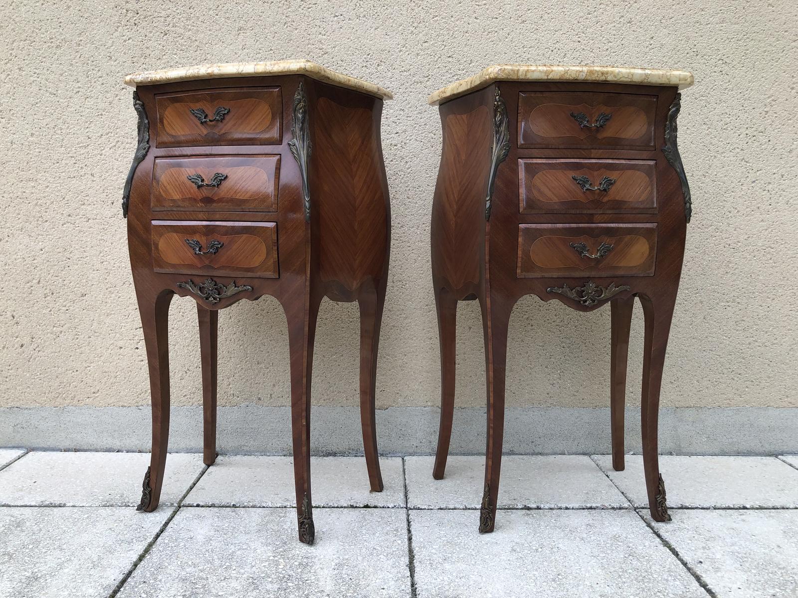 French Bedside Tables Marquetry Cabinets with Marble Tops