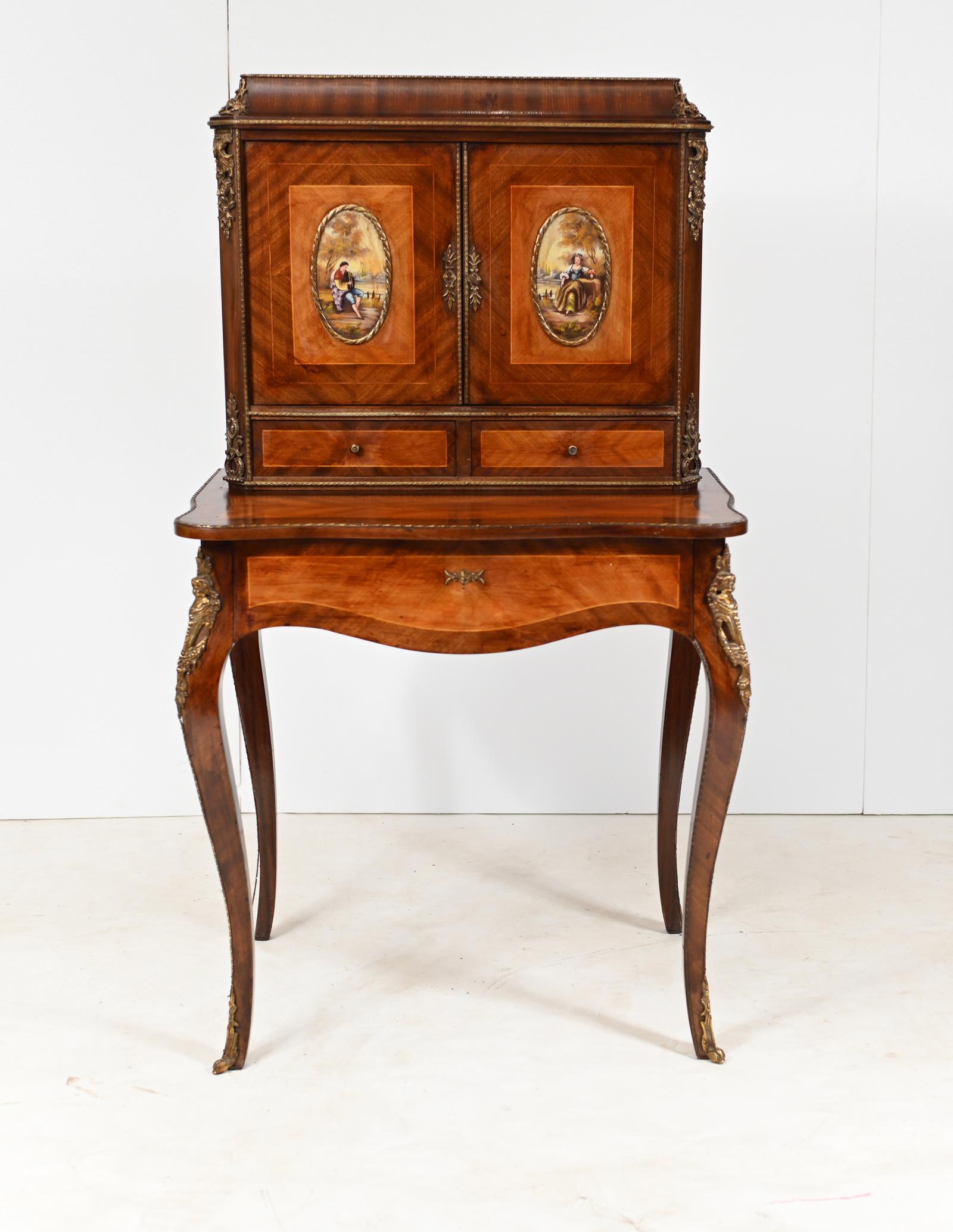 French Bonheur De Jour Desk Painted Placques Kingwood 1930s