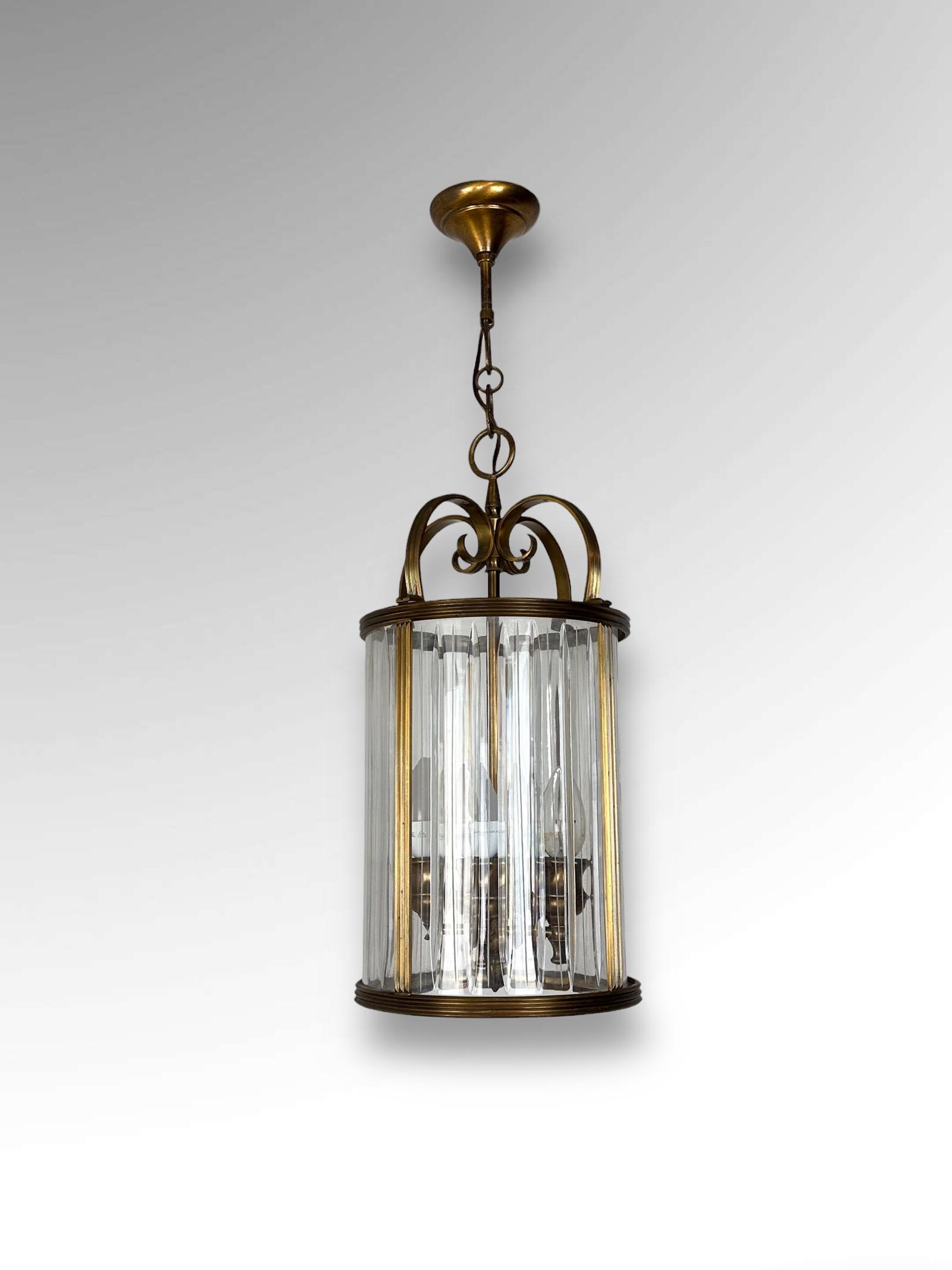 This French Brass Hall Lantern Ceiling Light Ribbed Glass Shade is located in Shropshire, United Kingdom