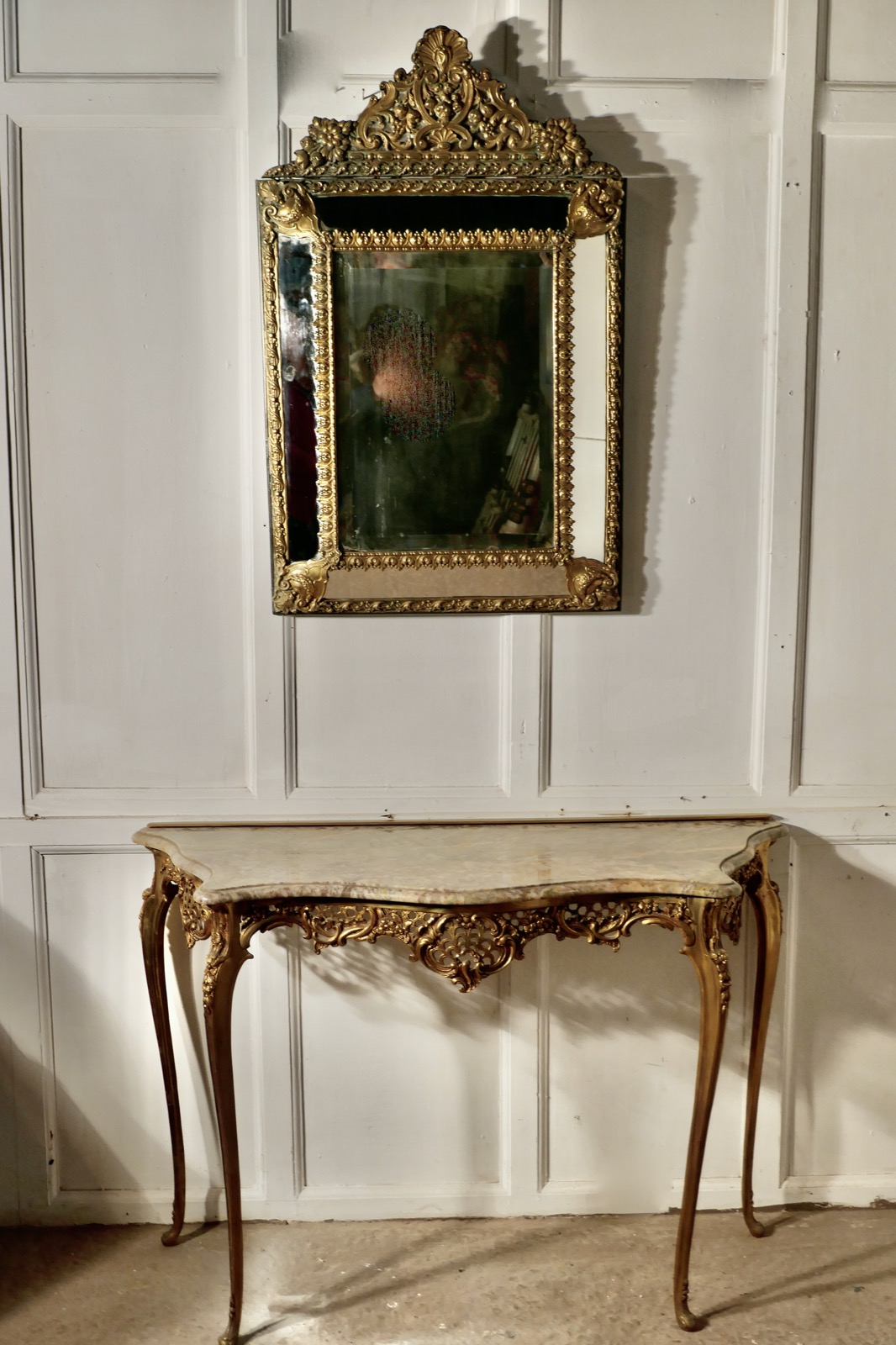 French Brass & Marble Console Table with Matching Cushion Mirror