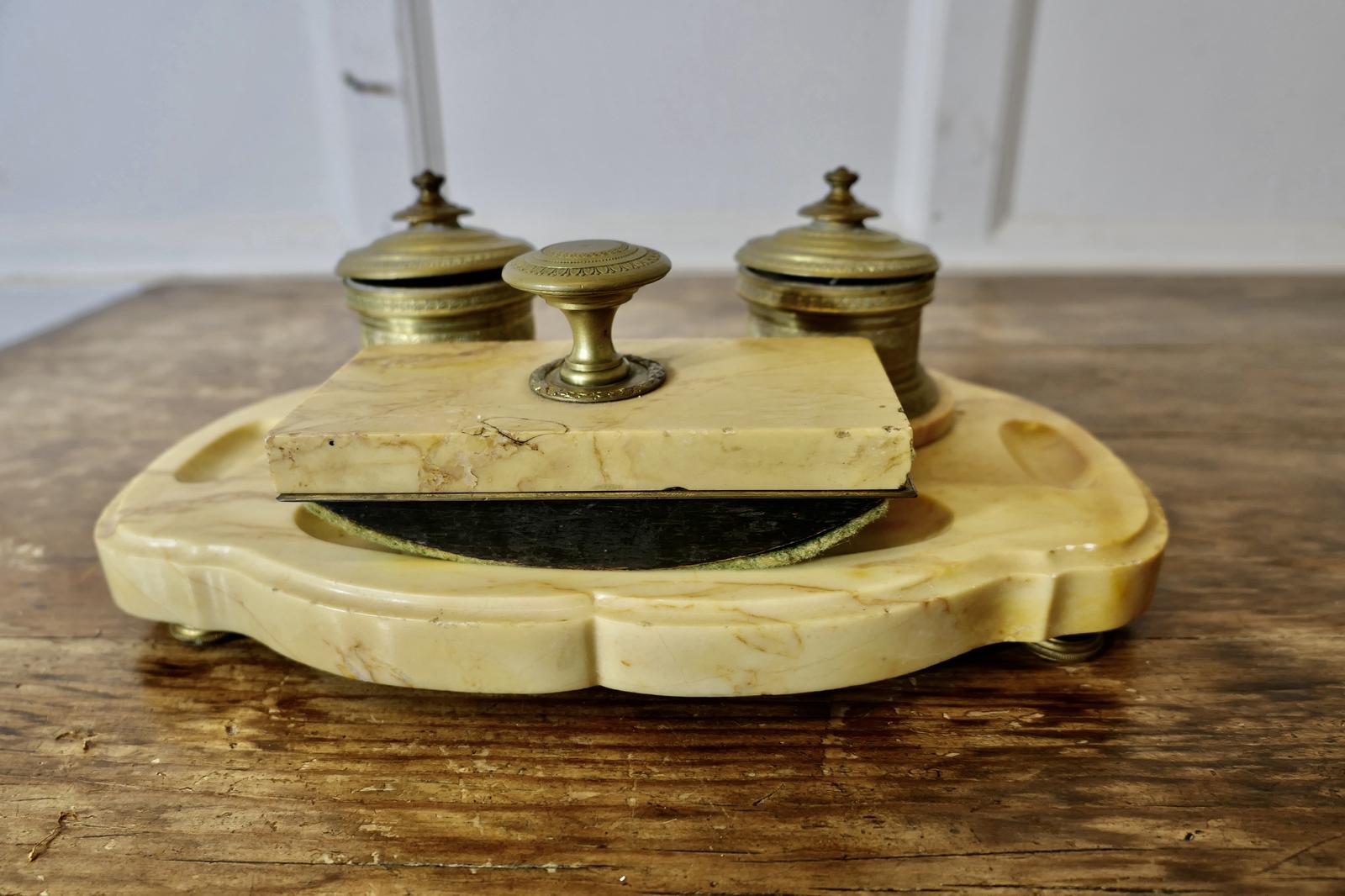 French Brass & Marble Desk Inkwell Stand