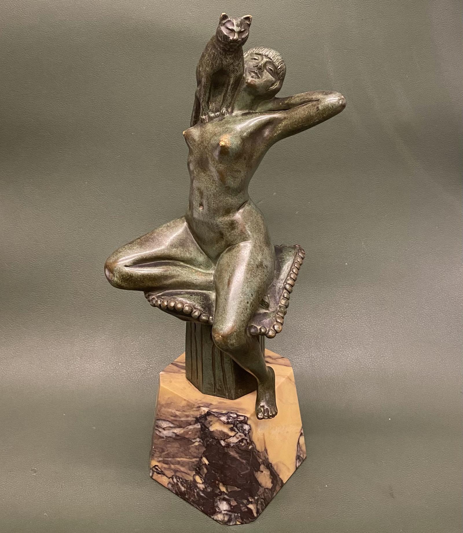French Bronze Figure of Nude Female with Cat - Signed R.C.Ireland