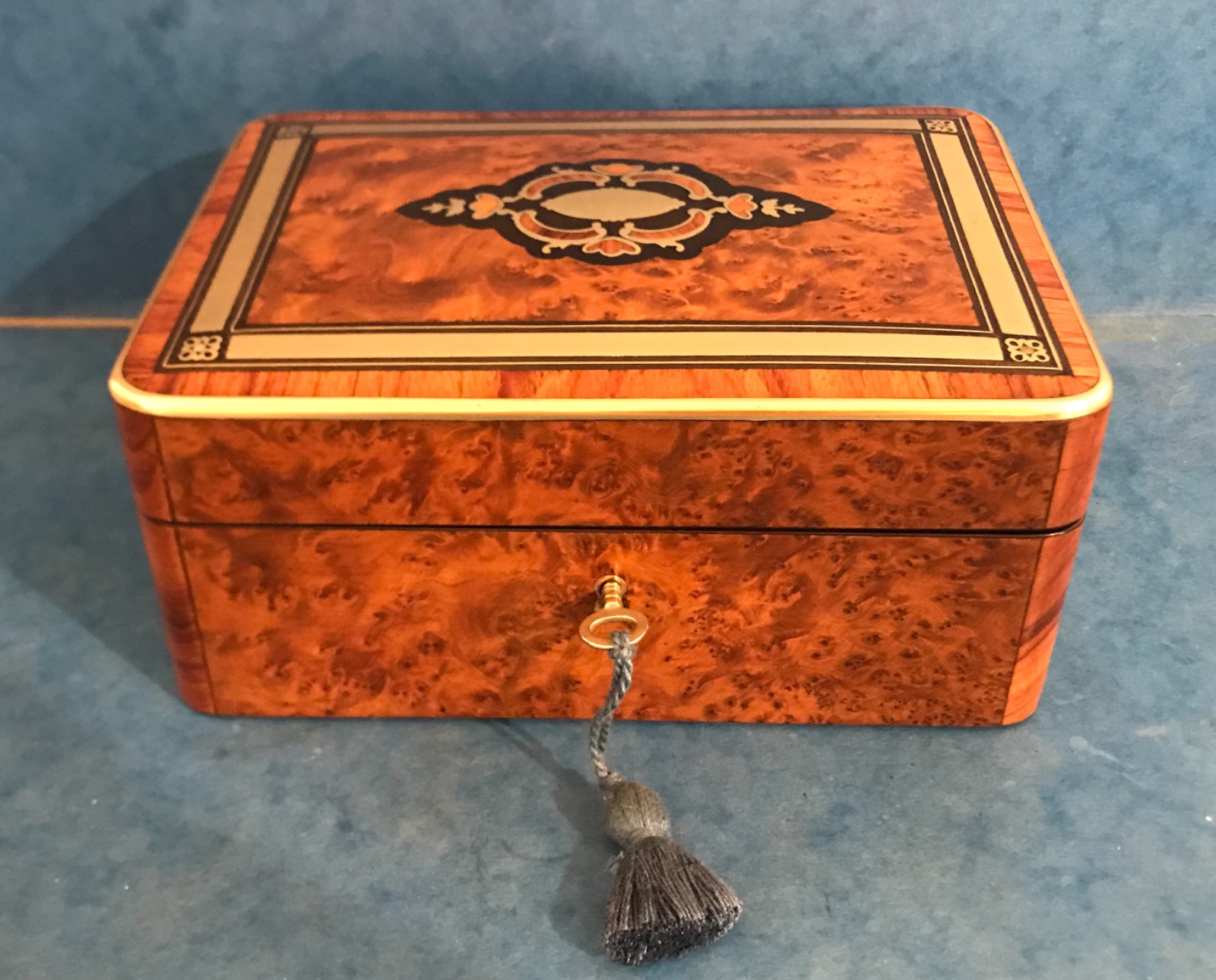 French Burr Cedar Brass & Mother of Pearl Inlaid Box c.1870