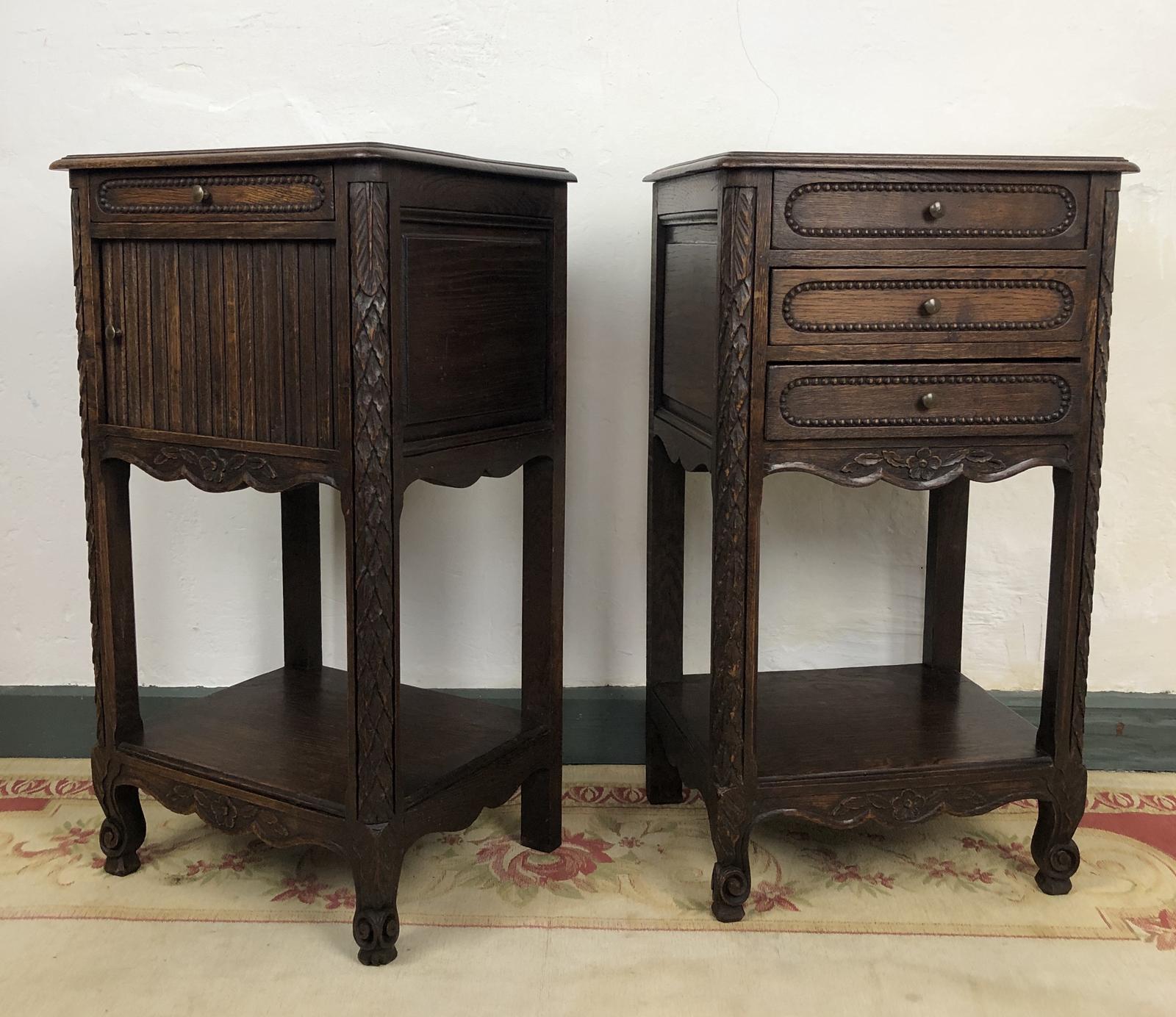 French Carved Bedside Tables Tambour Door & Drawers