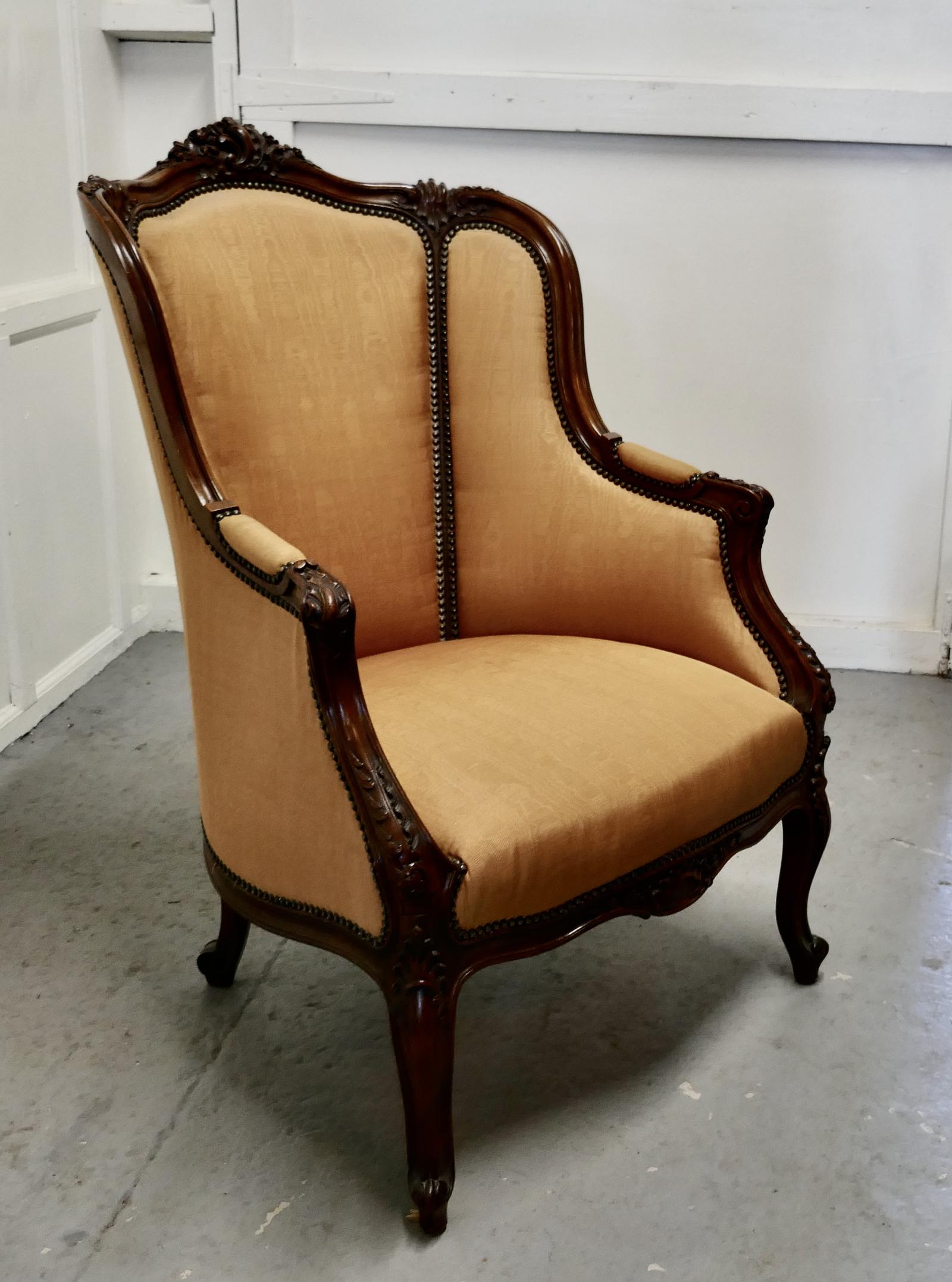 French Carved Walnut & Salon Chair, Upholstered in Silk