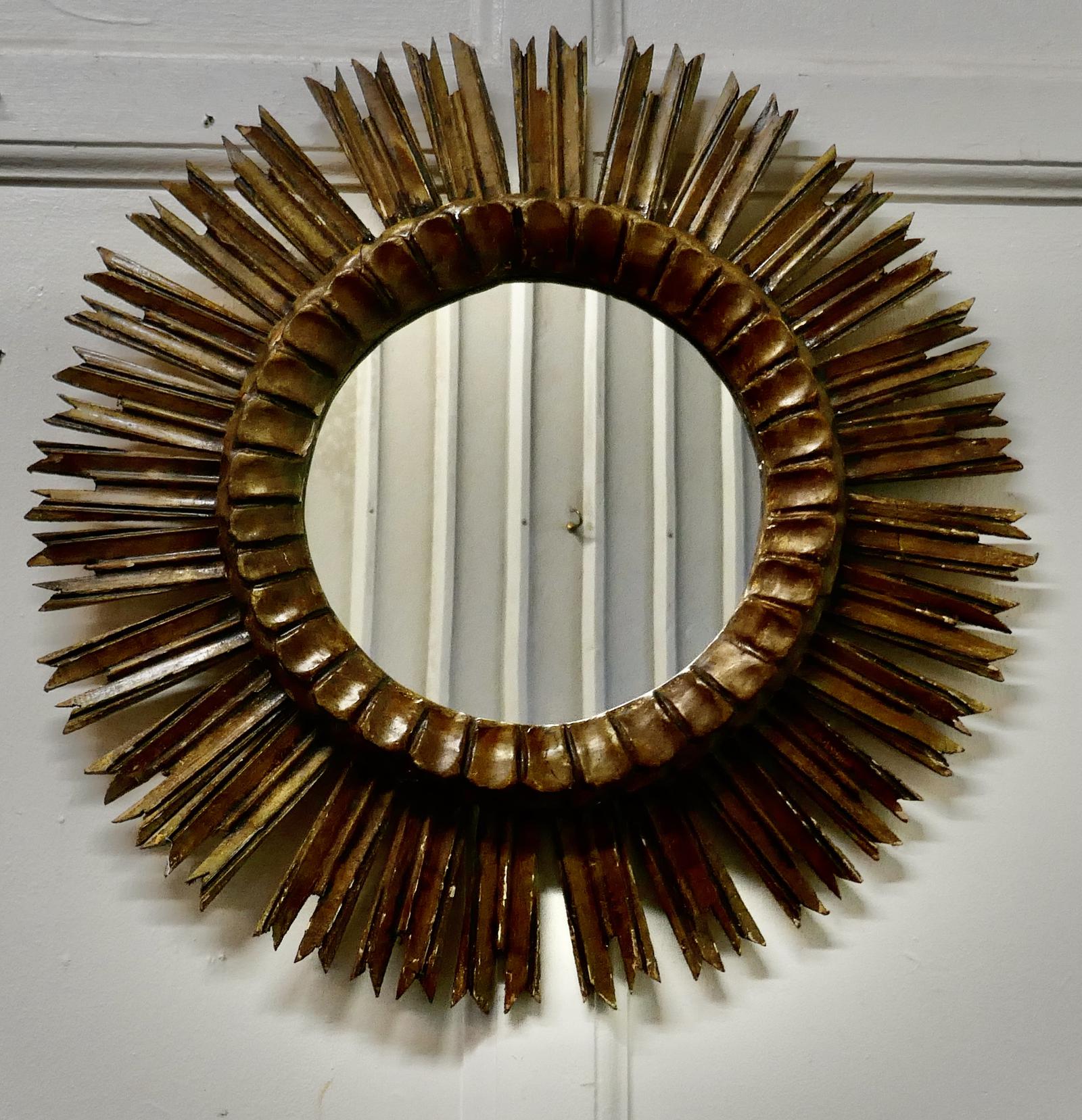French Carved Wood Art Deco Odeon Style Sunburst Mirror