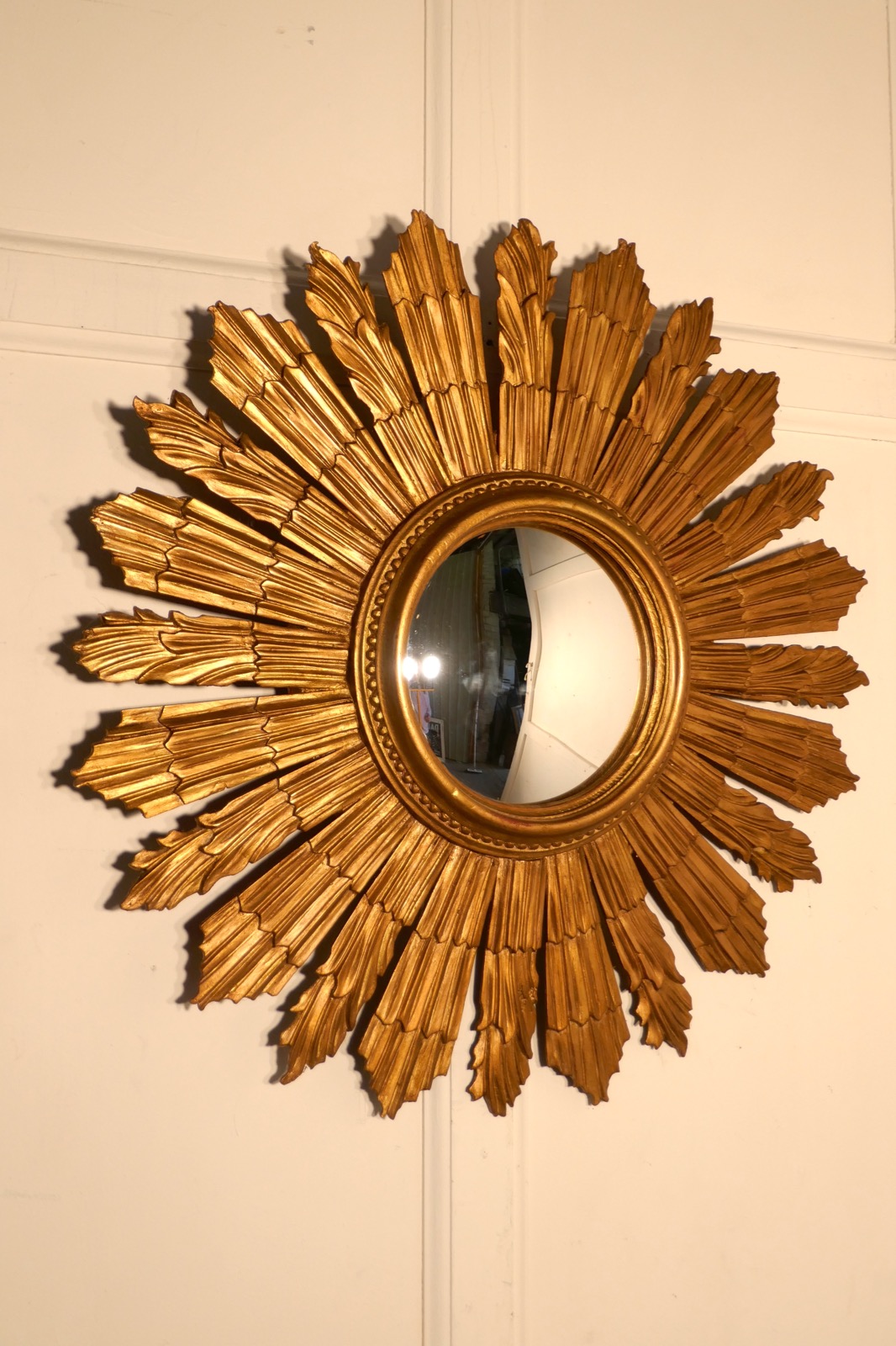 French Carved Wood Art Deco Odeon Style Sunburst-Starburst Convex Gilt Mirror