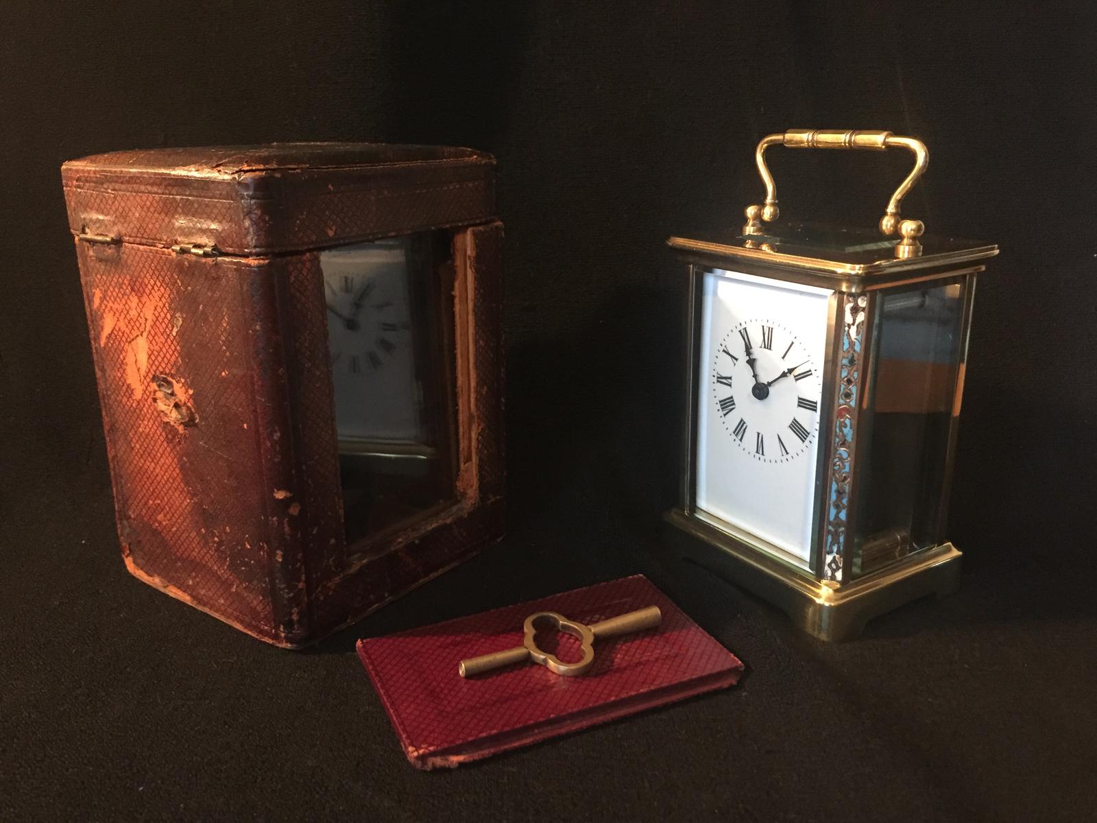 French Champlevé Enamelled Carriage Clock Complete with Original Carrying Case & Key c.1880
