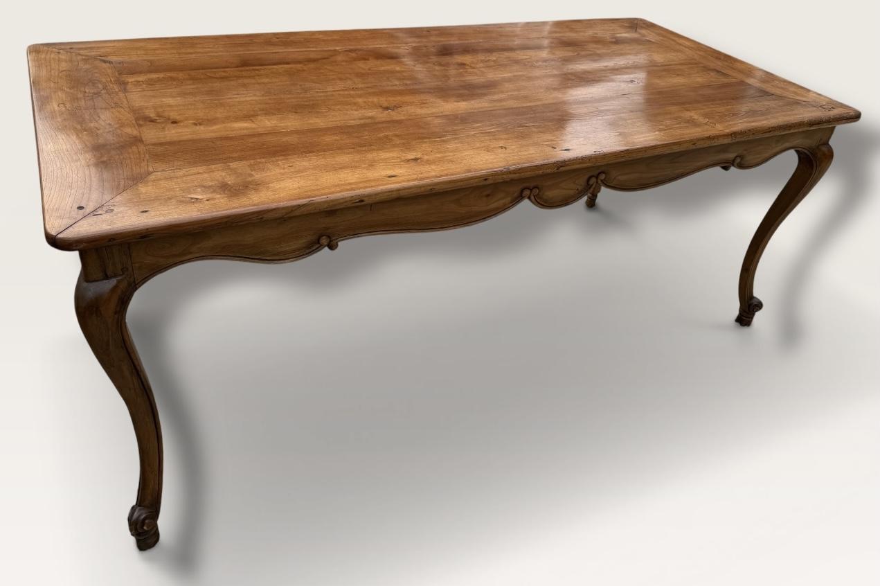 French 19th Century antique farmhouse table of elegant design having a slender cabriole leg and a shaped apron. In Cherrywood of excellent colour. Having plenty of space for knees, and being a good width. All recently cleaned and waxed.