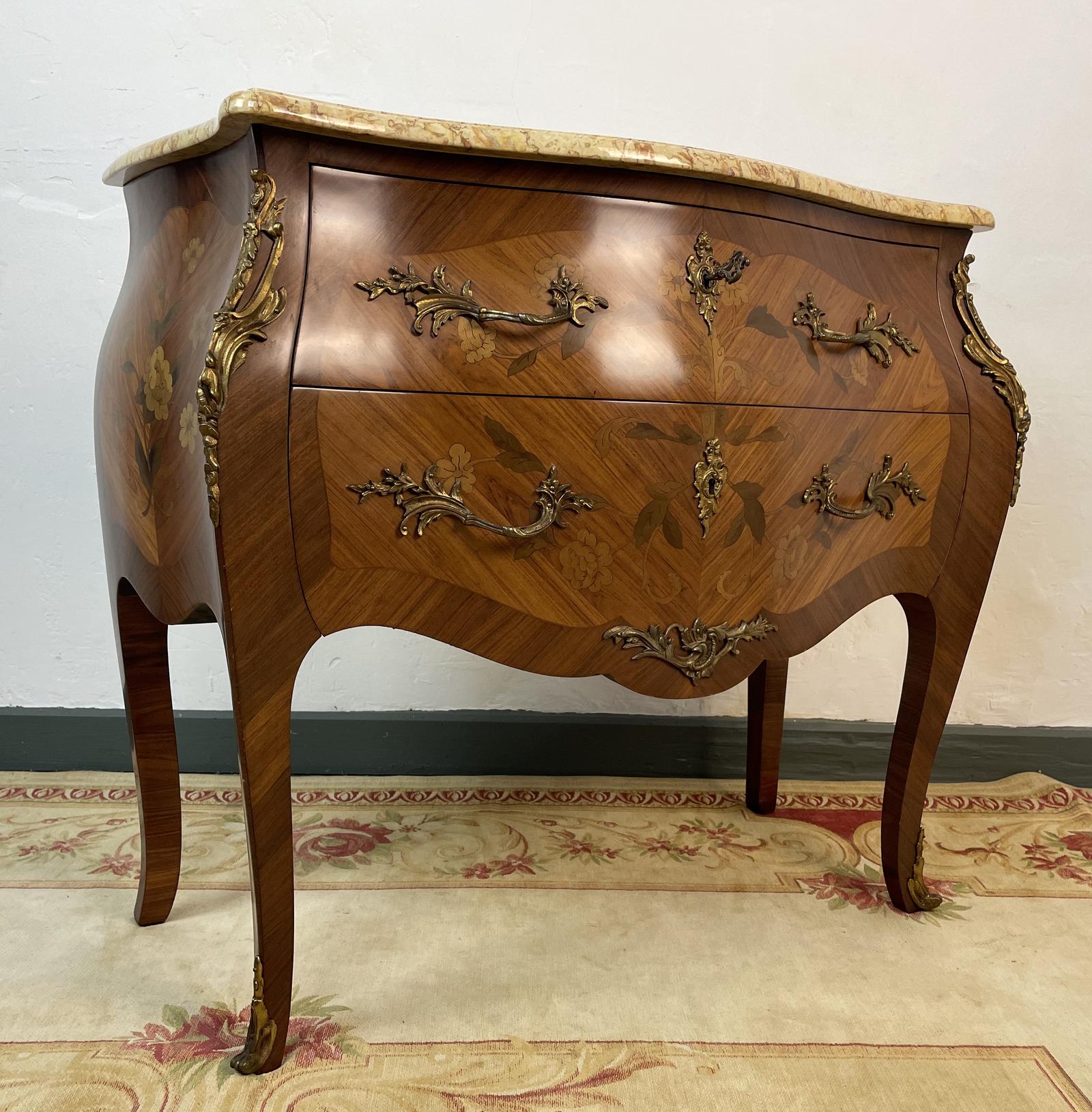 French Chest of Drawers Bombe Commode Marble Top Marquetry Ormolu Louis XV Style