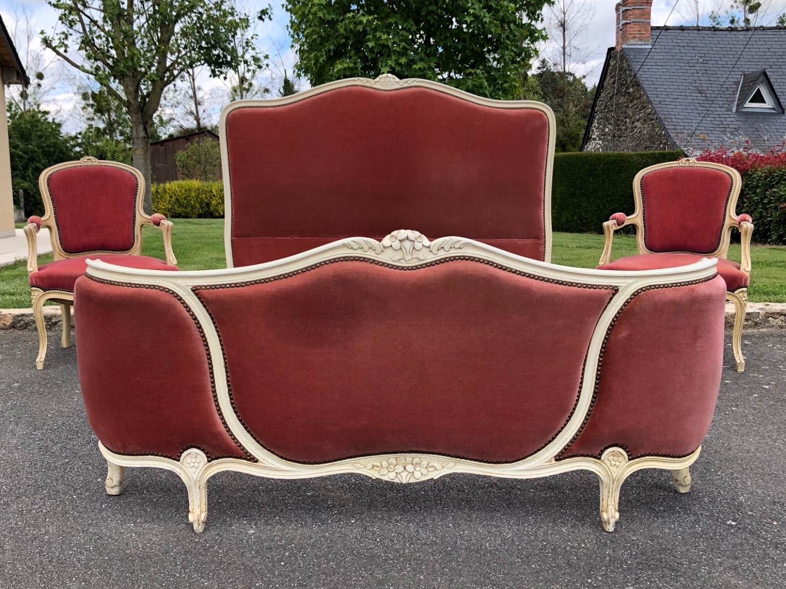 French Demi Corbeille Upholstered Double Bed Frame & Matching Chairs