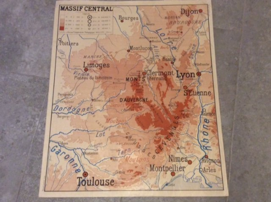 French Double Sided School Map of the Central Massif & Jura Showing Rivers, Mountains, Towns & Cities