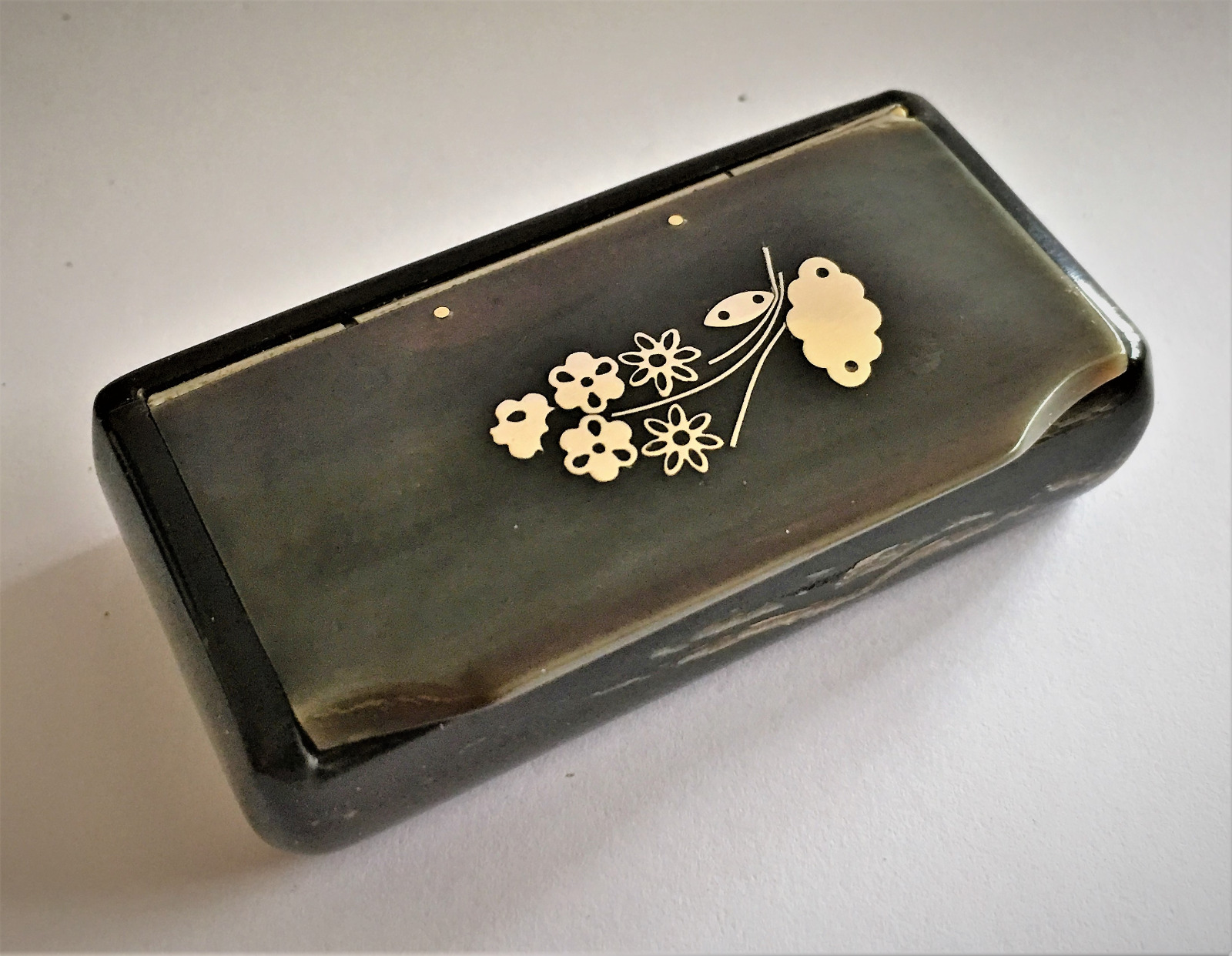 French Early 20th Century Polished Horn Snuff Box with Inlaid Floral Motif
