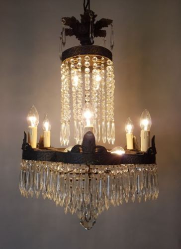 French Empire Aged Brass Waterfall Chandelier; Rewired c.1920